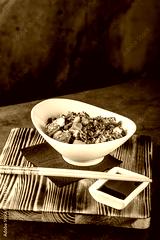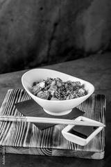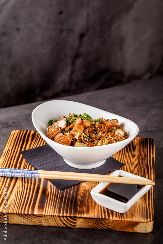 Asian food. Japanese rice with seafood, squid and salmon fillet with vegetables. Sprinkled with black and white sesame seeds. Serving dishes in a white plate in a restaurant.