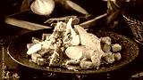 American Italian cuisine. Caesar salad with large pieces of grilled chicken, quail eggs, lettuce, tomatoes, parmesan cheese. Serving dishes in restaurant on black plate. copy space