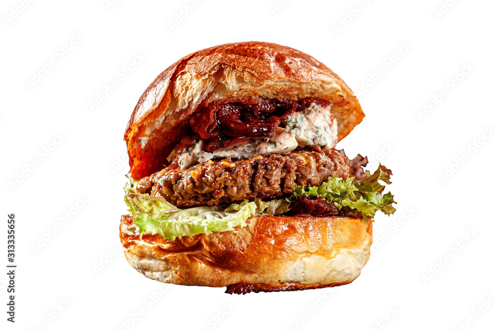 American cuisine concept. A juicy meat burger with a large Cutlet. Cooking burgers at home. Background image for a menu in restaurants or cafes. copy space