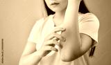 Woman hand touching elbow from chronic joint rheumatism and there is so much suffering. on the gray background.
