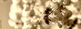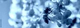 Honey bee pollinates yellow flowers barberry in the garden on background of blue sky. Nature in spring. Panoramic banner.