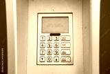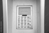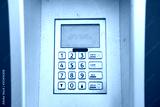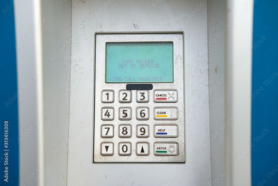 Out of Order Cash ATM machine showing an LCD display that the teller machine is out of service. Located outside a major bank, weathering can be seen on the metal.