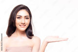 Beautiful young asian woman show on hand or beauty, spa product, brand, goods with satisfied, love it. Gorgeous female like it, feel happy with smiley face. She has perfect facial skin. Skin care, spa