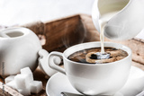 Coffee cup and roasted coffee beans on wooden tray. Pouring milk.