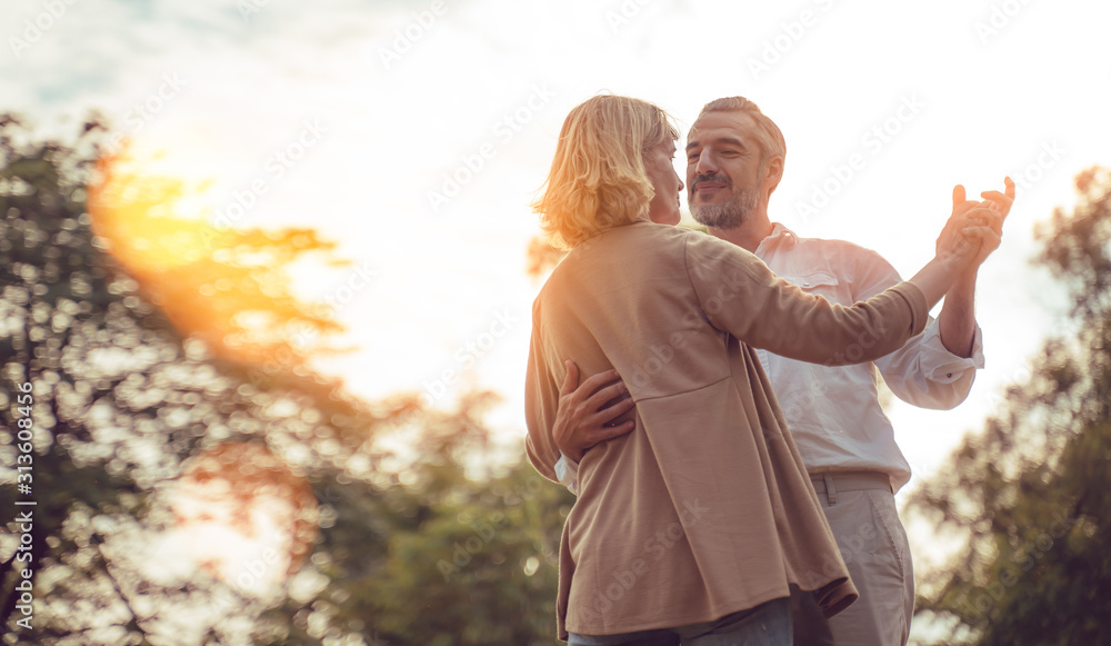 Senior active caucasian couple dancing and holding hands looks happy in the park in the afternoon autumn sunlight,bokeh,anniversary,happily retired with copy space.Concept health insurance