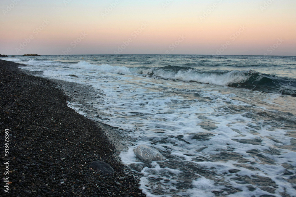 Sea waves crashing at sunset on the shore of the black, volcanic Kamari beach on the island of Santorini