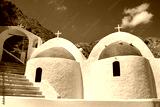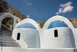 The characteristic white and blue church against the rocky hills of the island of Santorini
