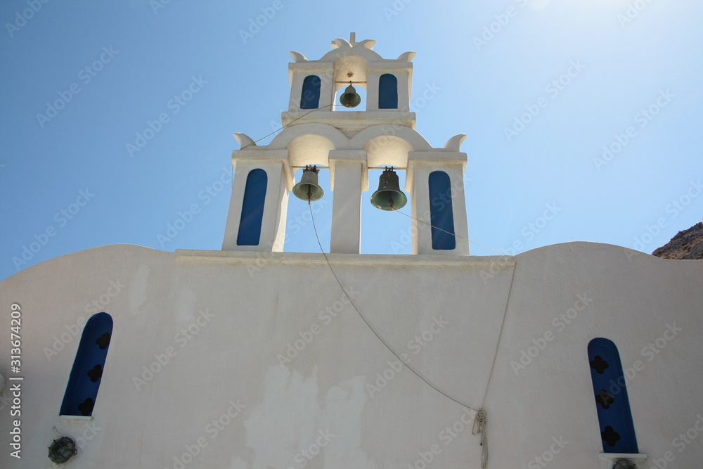 White-blue belfry of the church against the sky - the symbol of Santorini