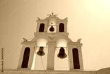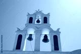 White-blue belfry of the church against the sky - the symbol of Santorini