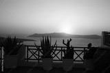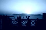 View of the island of Nea Kameni, the sea and the caldera of Santorini at sunset