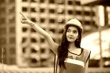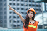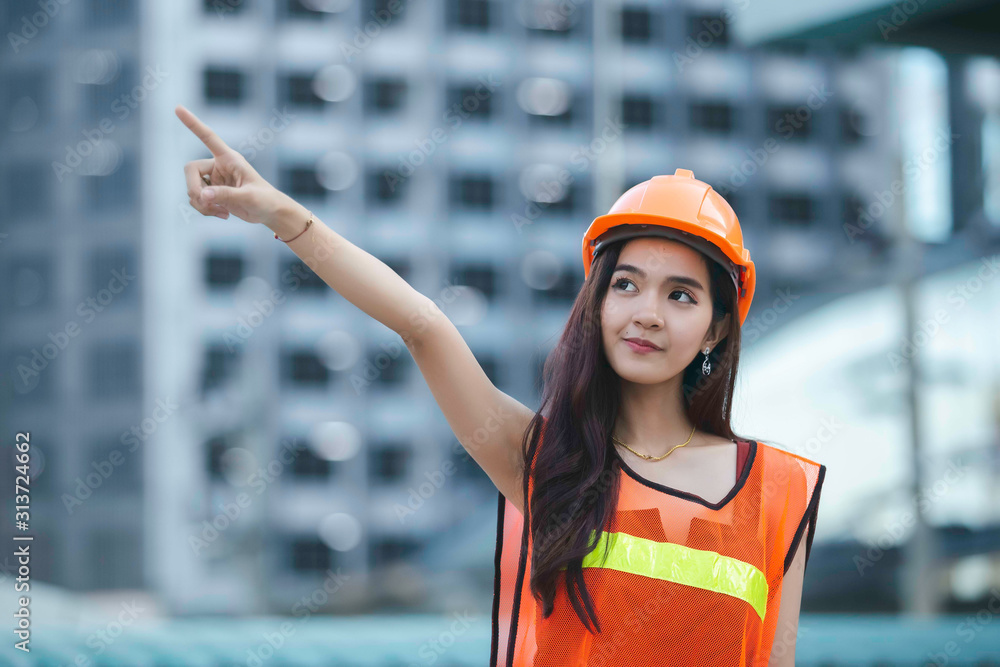 Portrait asian engineer women in uniform waistcoat with protective helmet on building background