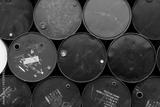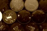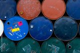 Old chemical barrels. Blue, green, orange oil drum. Steel oil tank. Toxic waste warehouse. Hazard chemical barrel with warning label. Industrial waste in metal drum. Hazard waste storage in factory.