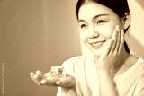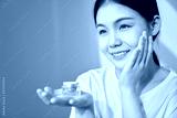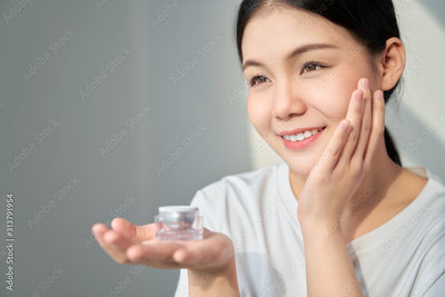 Smile Asian woman skin beauty and hand holding a product cream bottle for spa products and make up. The skin is smooth and beautiful.