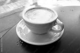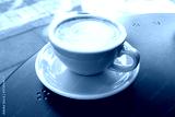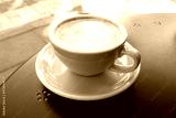 A yellow cup of coffee on the table. A fresh morning coffee time in downtown street cafe.