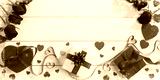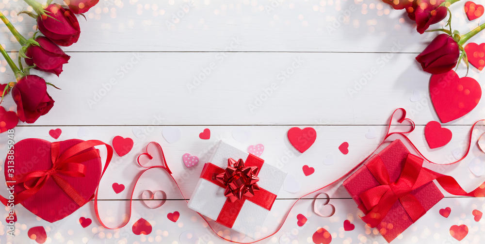 Gift boxes, ribbon hearts and roses on white table.