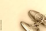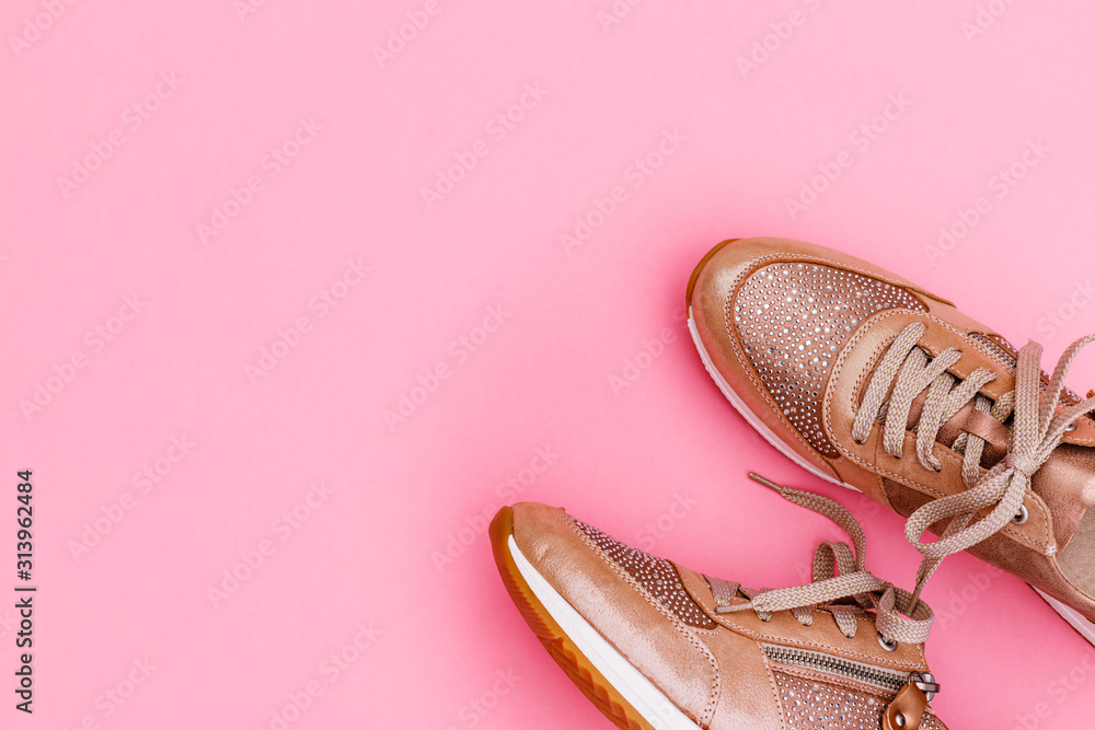 Women's shoes with sequins, laces, zipper. Fashion frame of Rose gold glitter Women Sneakers, copy space, text place. Trendy fashionable Footwear in Nude Rose color on pink background, flat lay