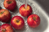 Close-up Washing red apples in a stainless steel kitchen sink.