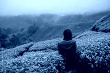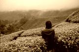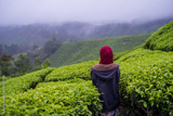 Portrait of cute young Muslim woman in red hijab, smile and happy with beautiful view of nature tea farm landscape at Cameron highlands