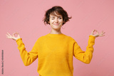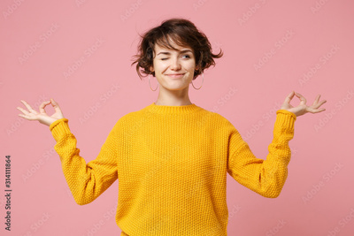 Funny young brunette woman girl in yellow sweater posing isolated on pastel pink background. People lifestyle concept. Mock up copy space. Hold hands in yoga gesture relaxing meditating looking aside.