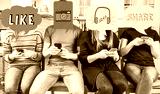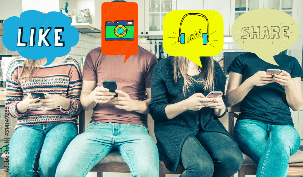 People of the millennium generation use smartphones - speech bubbles and symbols of communication in social media.