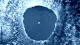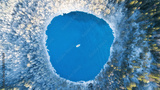 Aerial view of the winter lake with clear blue sea water and boat. Abstract picture. Above captured with a drone. Beautiful snowy forest.