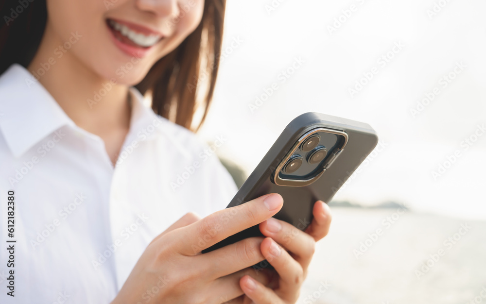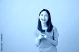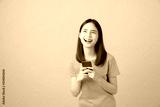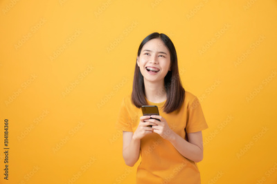 Cheerful beautiful Asian woman holding smartphone on light yellow background.