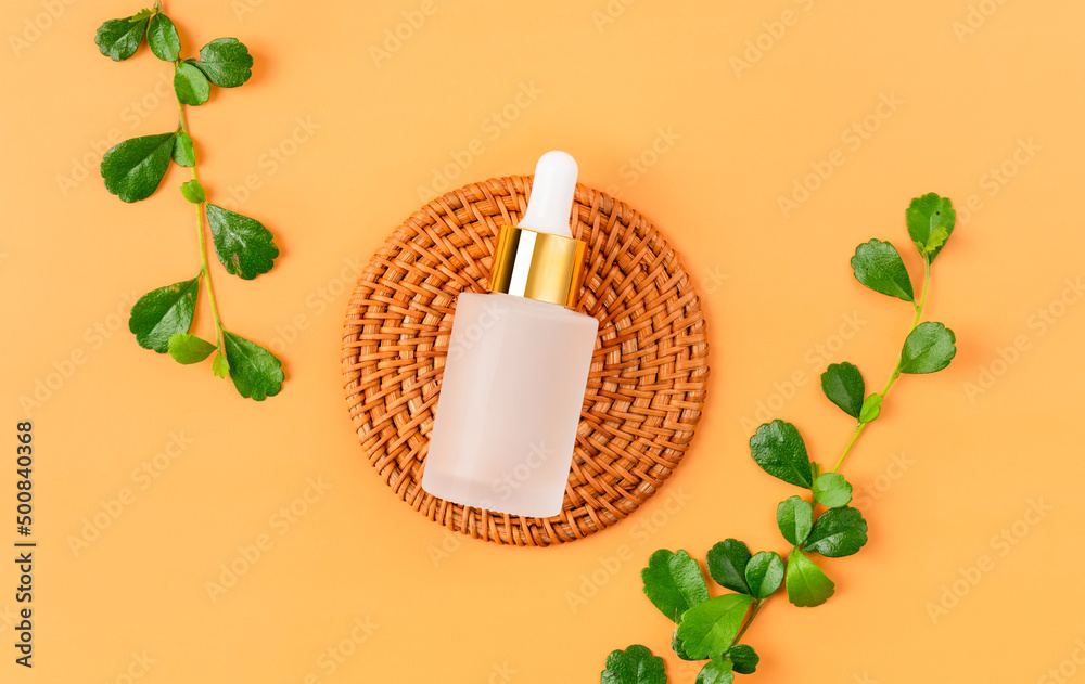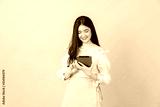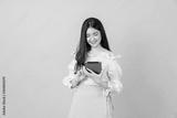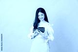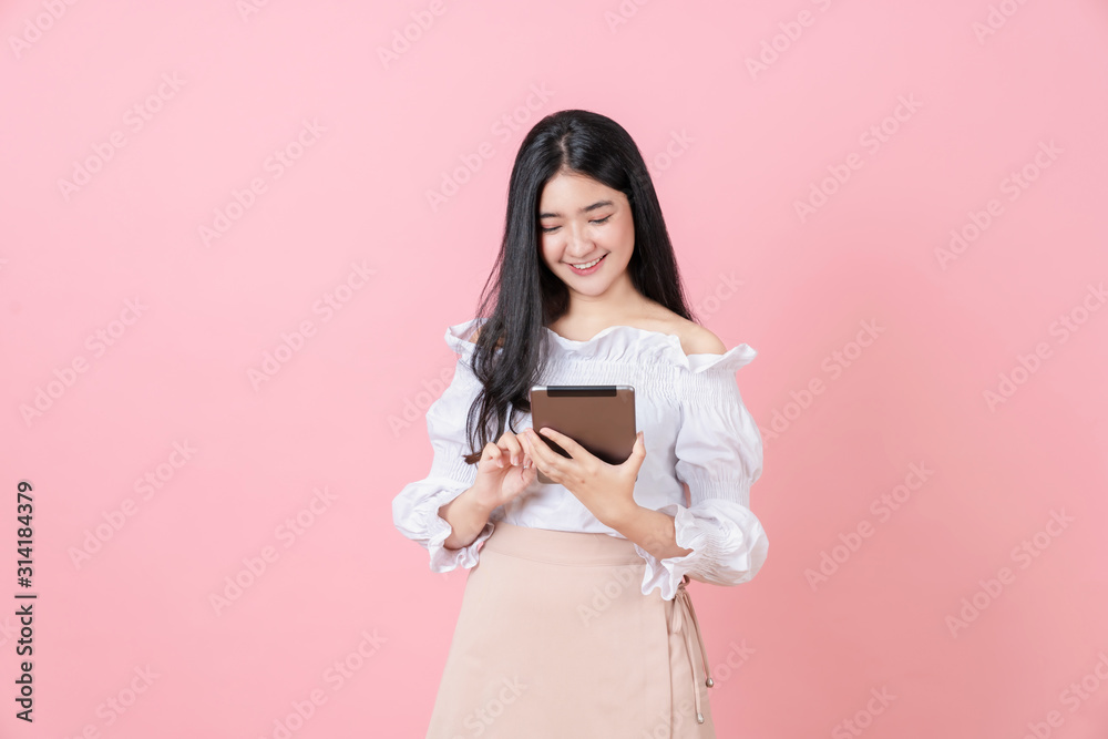 Young smiling Asian woman holding digital tablet and looking to screen on pink background.