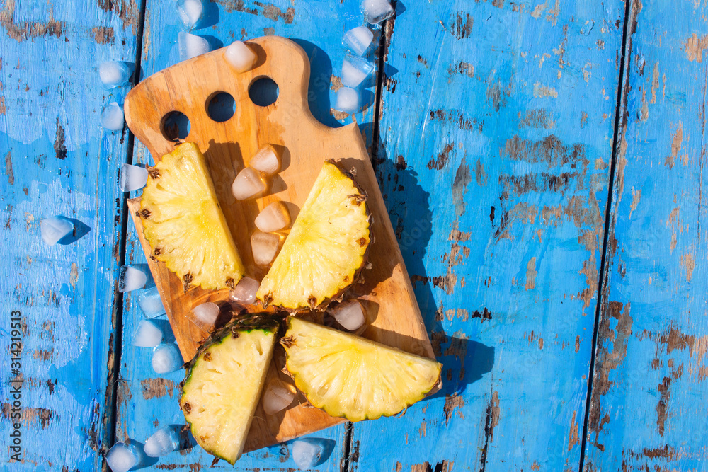 fresh pineapples and ice cubes on cutting board isolated on a blue wooden background, copy space