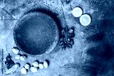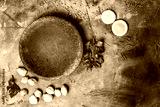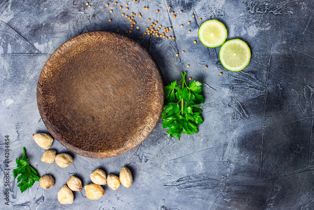 Herbs and spices cooking on stone table. Basil, rosemary, pepper and salt. Top view with copyspace