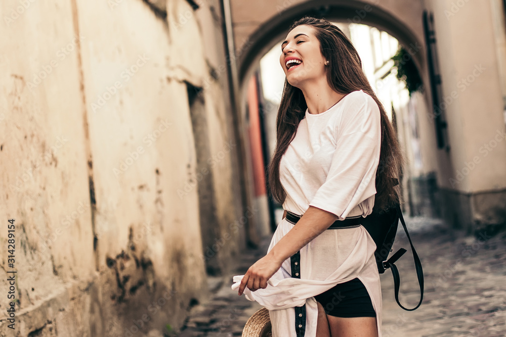 Young stylish woman walking on the old town street, travel with backpack, straw hat, wearing trendy outfit.