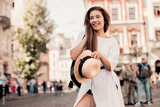 Young stylish woman walking on the old town street, travel with backpack, straw hat, wearing trendy outfit.