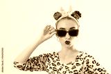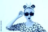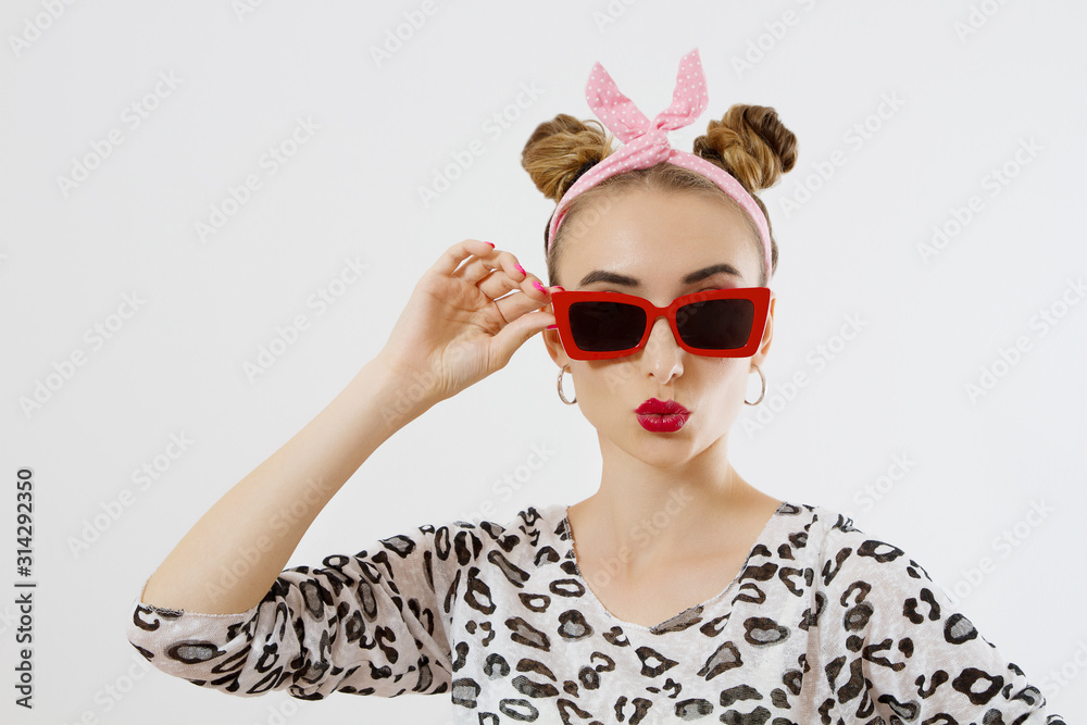 Close up fashion woman portrait isolated on white background. Happy girl face in red sunglasses. Amazing and excited female with funny hairstyle. Red lipstick makeup.