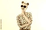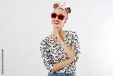 Happy woman face closeup. Summer fashion and accessories. Closeup female portrait in red sunglesses and colorful makeup. Isolated on white background. Copy space