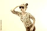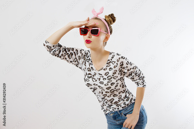 Happy woman face closeup. Summer fashion and accessories. Closeup female portrait in red sunglesses and colorful makeup. Isolated on white background. Copy space
