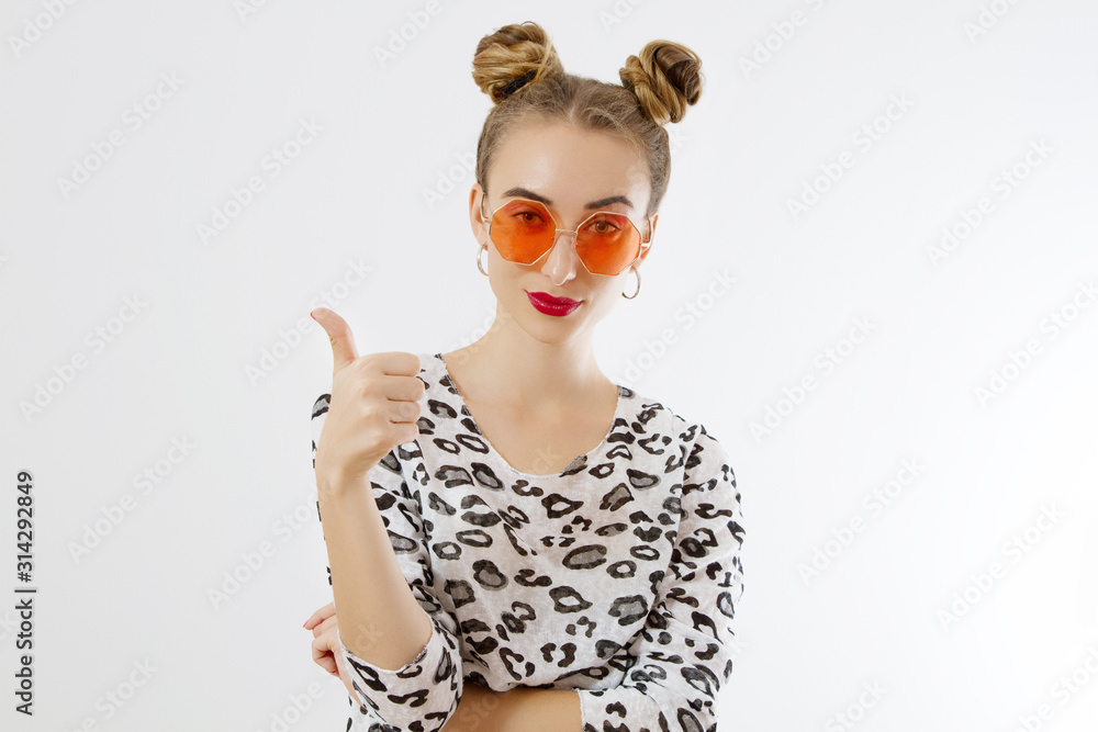 Close-up woman face. Fashion female closeup in trendy clothes isolated on white background. Summer fun time and summertime accessories. Funny girl. Big thumb up. Selective focus