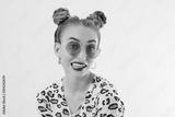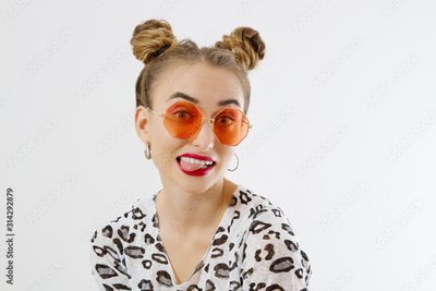 Shouting woman face. Fashion crazy female closeup in trendy clothes isolated on white background. Summer fun time and summertime accessories. Funny girl.