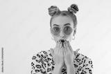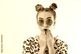 Close-up woman face. Fashion female closeup in trendy clothes isolated on white background. Summer fun time and summertime accessories. Funny girl.