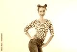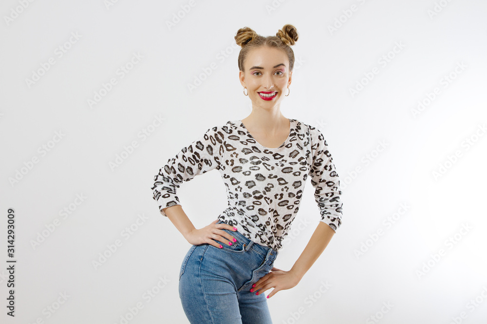 Close-up woman face. Fashion female closeup in trendy clothes isolated on white background. Summer fun time and summertime accessories. Funny girl.