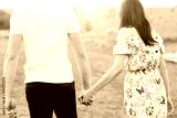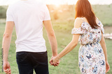 Young couple in love run on through grass field. Walking along grass field.