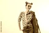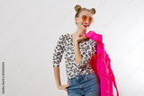 Happy, shock, excited woman face closeup. Girl in bright pink autumn clothes, red sunglasses isolated on white background, copy space. Beautiful female surprised, cheerful. Fun funny model screaming