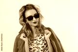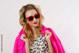 Happy, shock, excited woman face closeup. Girl in bright pink autumn clothes, red sunglasses isolated on white background, copy space. Beautiful female surprised, cheerful. Fun funny model screaming