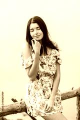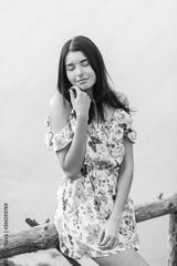 Young beautiful woman posing near lake.