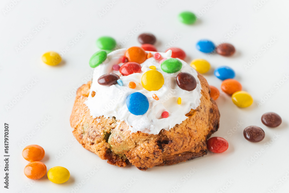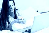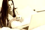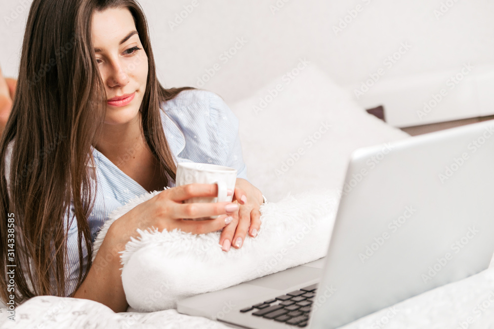 Young smiling woman working on laptop in her bedroom. Happy morning.
