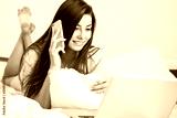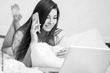 Beautiful young smiling woman working on computer in bed. Happy morning.