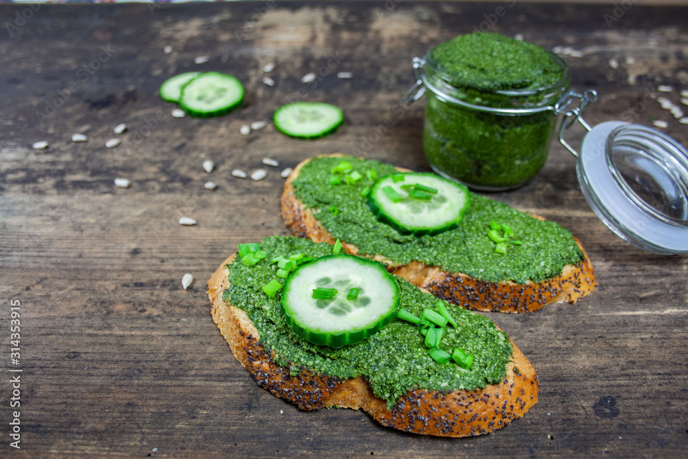 Vegetarian, healthy pate - green spinach and sunflower paste in a jar and on sandwiches