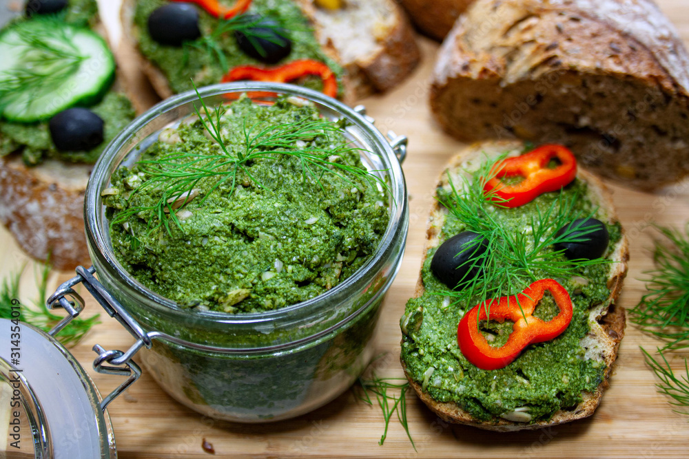 Wegetariański, zdrowy pasztet - zielona pasta ze szpinaku i ziaren słonecznika w słoiku i na kanapkach