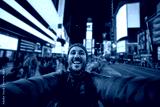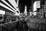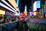 smiling young man taking a selfie with his smartphone on Times Square, New York. tourism in united states of America