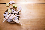 Chicken legs on a cutting board.