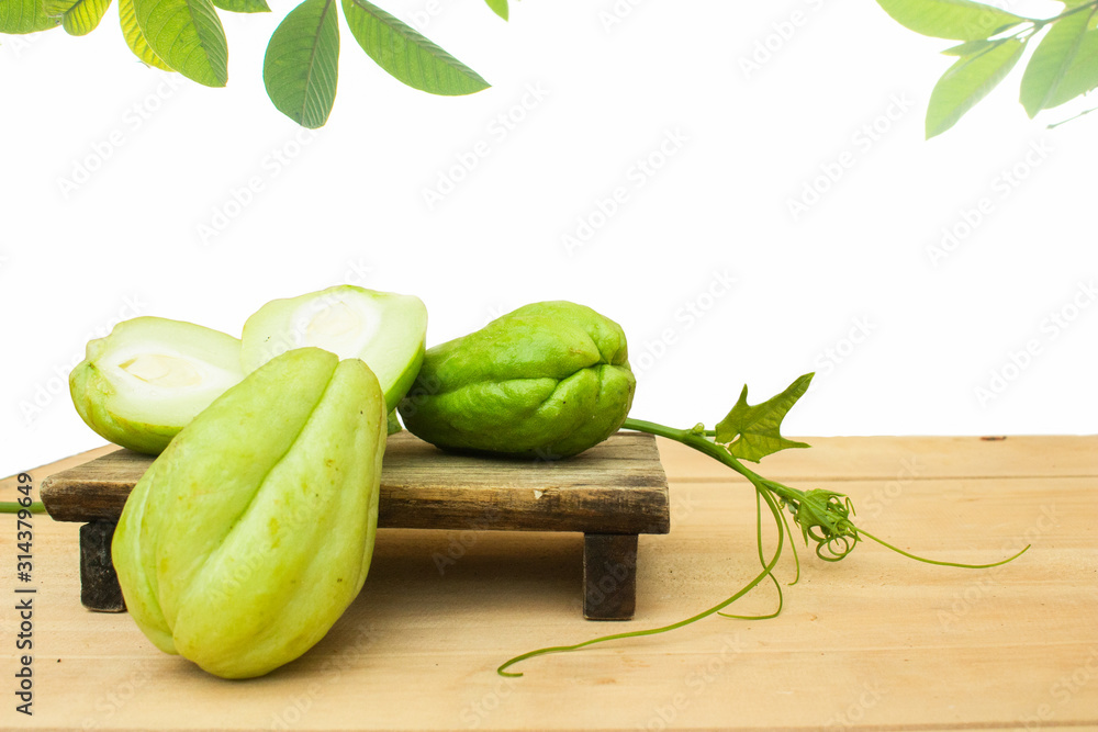 Fresh chayote fruits (Sechium edulis) on wooden background,copy space