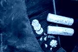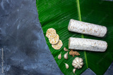 Tempe Soybean Cake is Traditional Indonesian Food made from fermented soybean.top view with banana leaves and cutting board, copy space